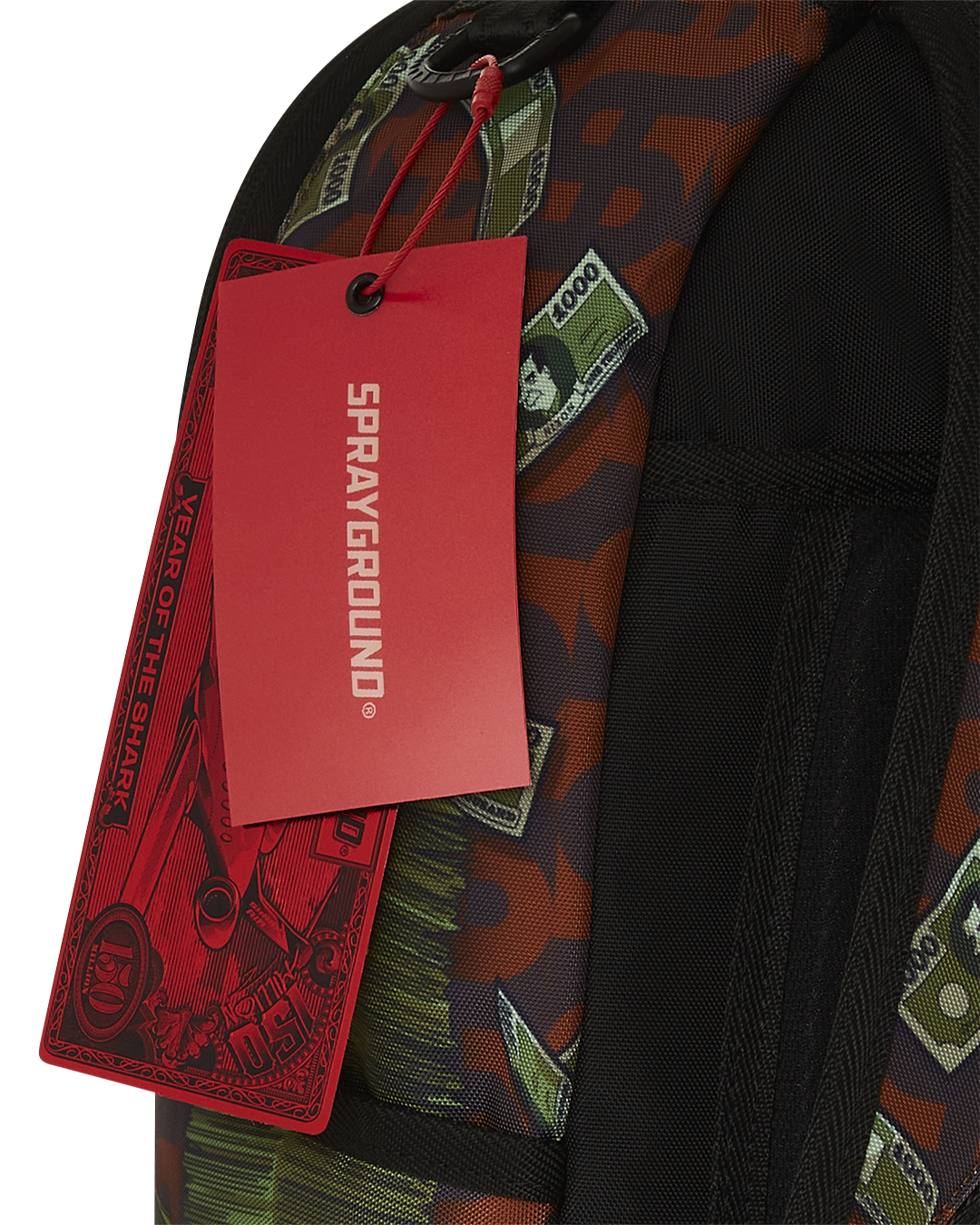 Dimensions: 18" x 6" x 11.5" • Front zipper pocket • Side pockets • Zippered Stash pocket • Separate velour sunglass compartment • Ergonomic mesh back padding • Adjustable Straps for custom sizing • Gold zippers with metal hardware • Metal "Sprayground Authentic" badge • Slide through back sleeve connects to carry-on luggage to free your hands