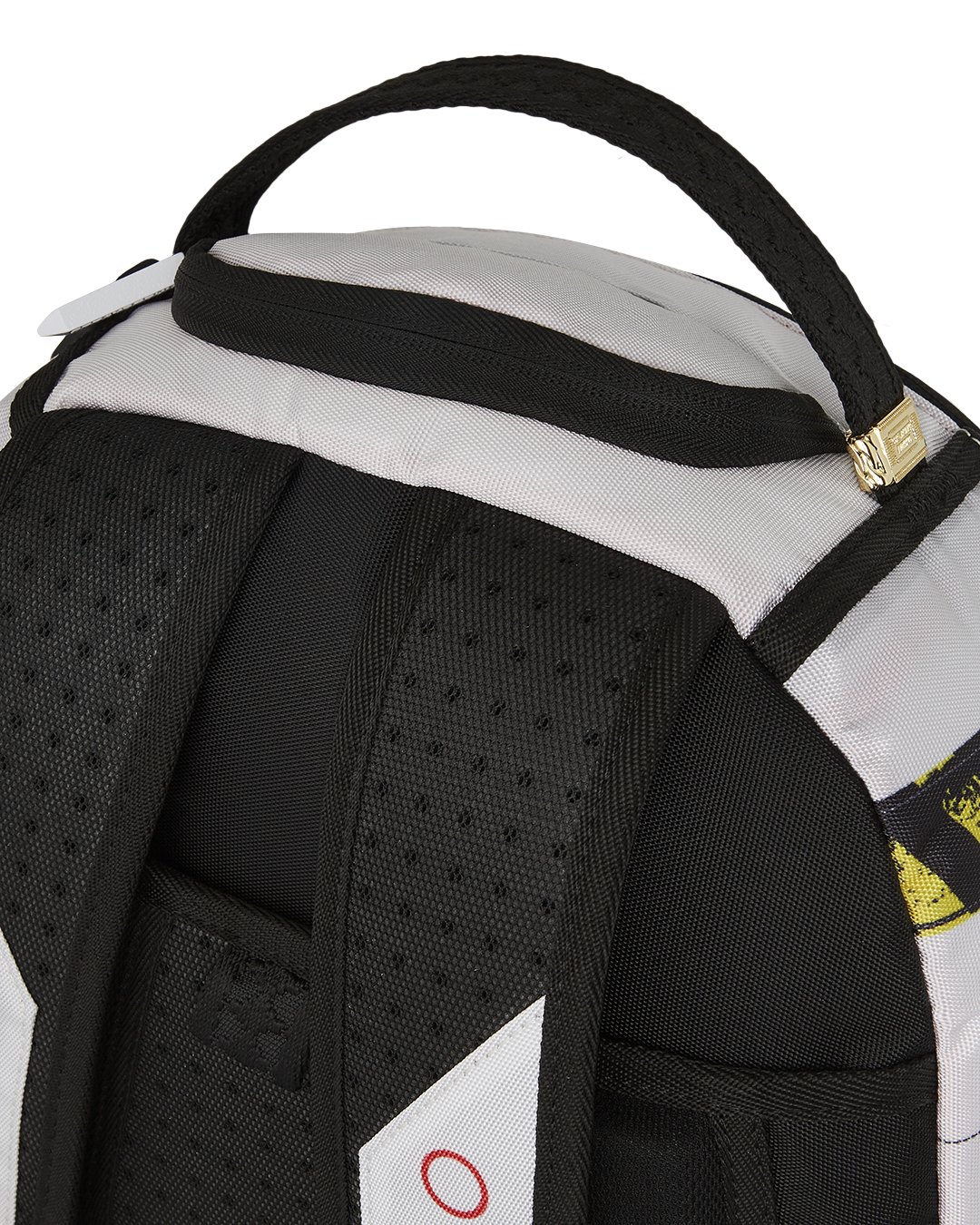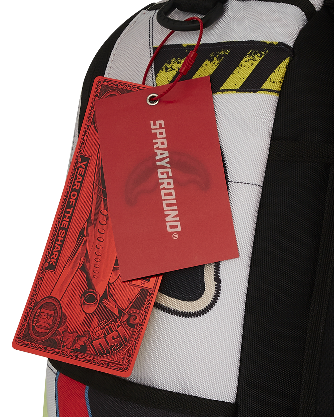 Dimensions: 18" x 6" x 11.5" • Front zipper pocket • Side pockets • Zippered Stash pocket • Separate velour sunglass compartment • Ergonomic mesh back padding • Adjustable Straps for custom sizing • Gold zippers with metal hardware • Metal "Sprayground Authentic" badge • Slide through back sleeve connects to carry-on luggage to free your hands