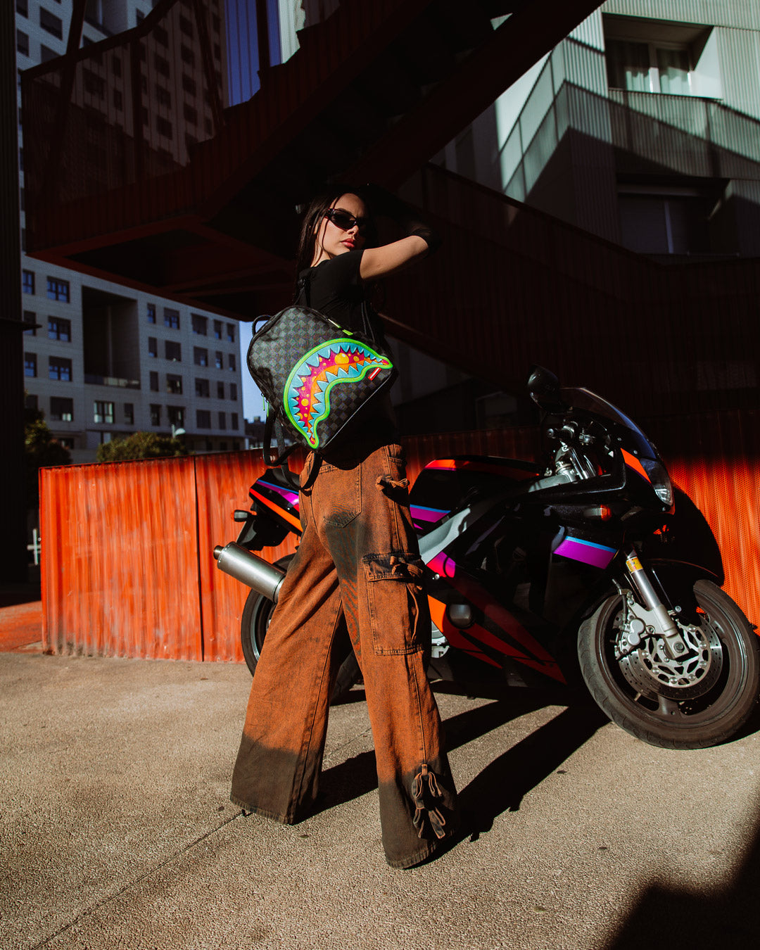 Dimensions: 10" x 5" x 11.5" • Two large main zippered compartments • Side pockets • Zippered Stash pocket • Adjustable straps for custom sizing • Gold zippers with metal hardware