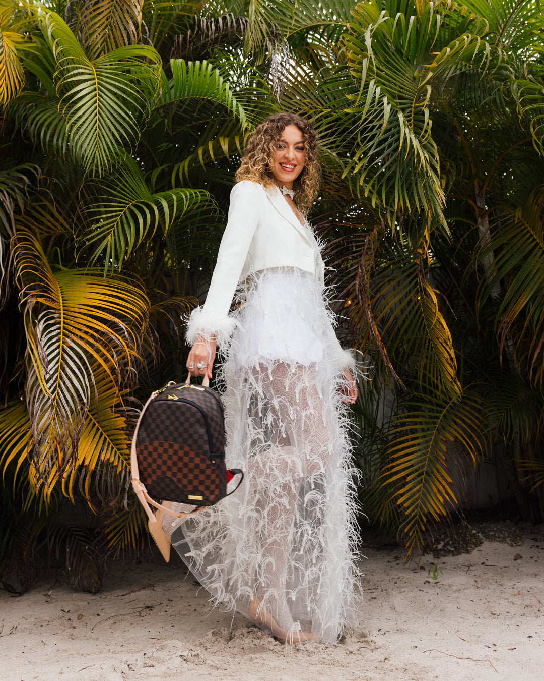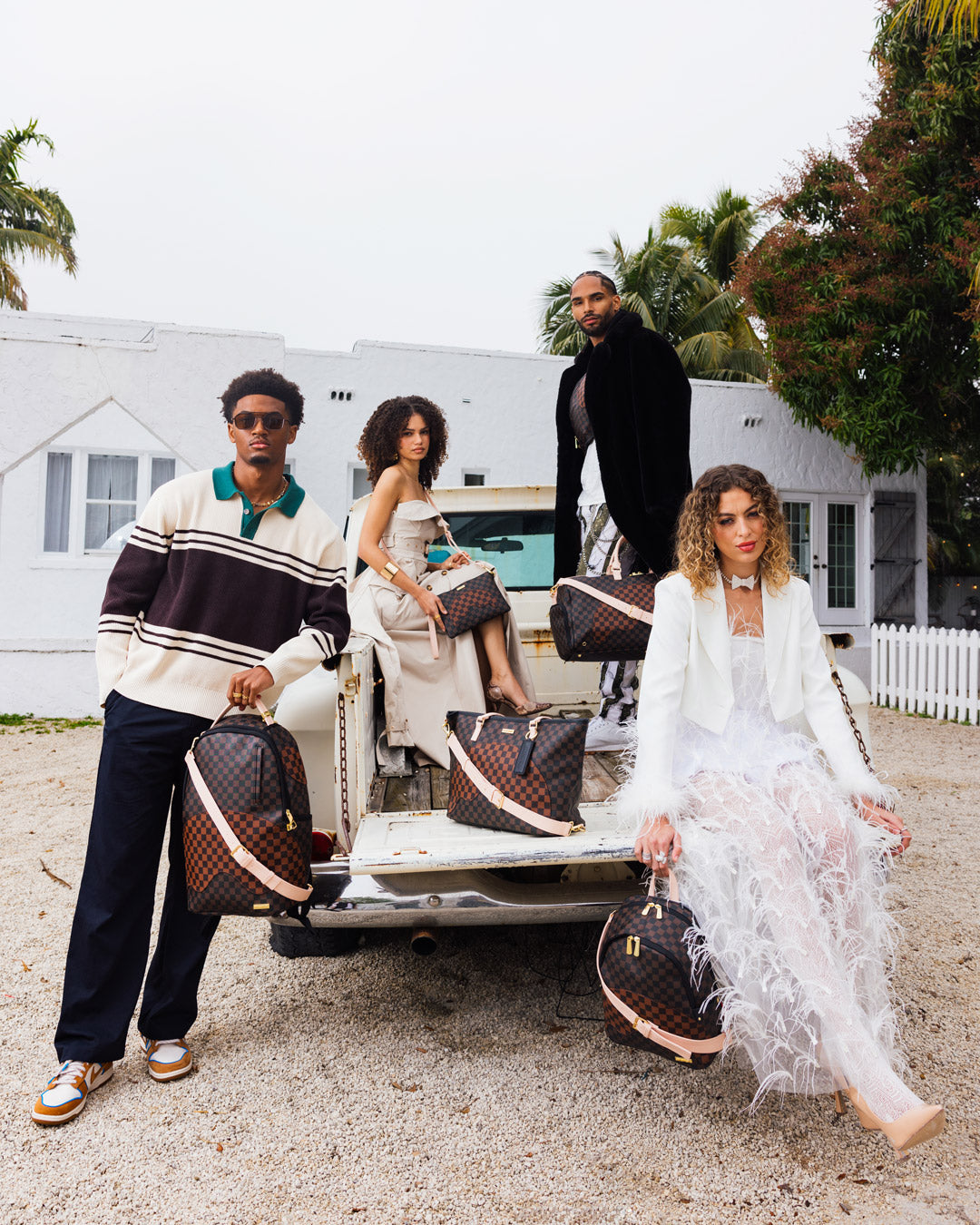 Dimensions: 10" x 5" x 11.5" • Two large main zippered compartments • Side pockets • Zippered Stash pocket • Adjustable straps for custom sizing • Gold zippers with metal hardware