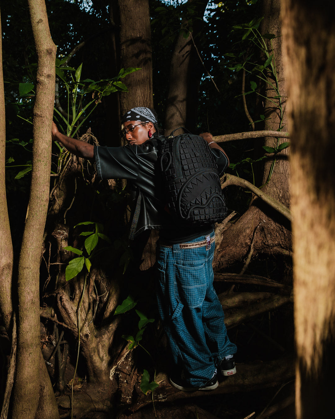 Dimensions: 18" x 6" x 11.5" • Front zipper pocket • Side pockets • Zippered Stash pocket • Separate velour sunglass compartment • Ergonomic mesh back padding • Adjustable Straps for custom sizing • Gold zippers with metal hardware • Metal "Sprayground Authentic" badge • Slide through back sleeve connects to carry-on luggage to free your hands